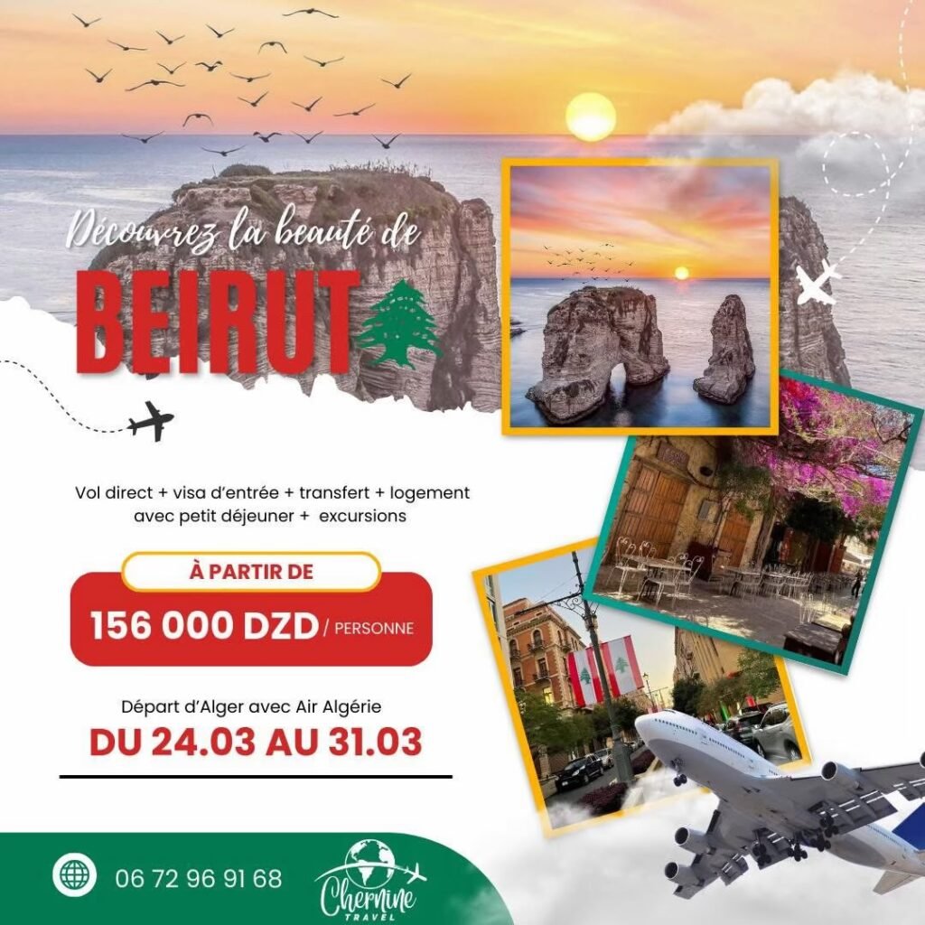 Nos programmes Voyage organisé – Beyrouth 🇱🇧 Vol direct Alger – Beyrouth avec Air AlgérieVisa d’entrée inclusTransferts aéroport – hôtelLogement avec petit déjeunerExcursions touristiques à Beyrouth À partir de 156 000 DZD / personne